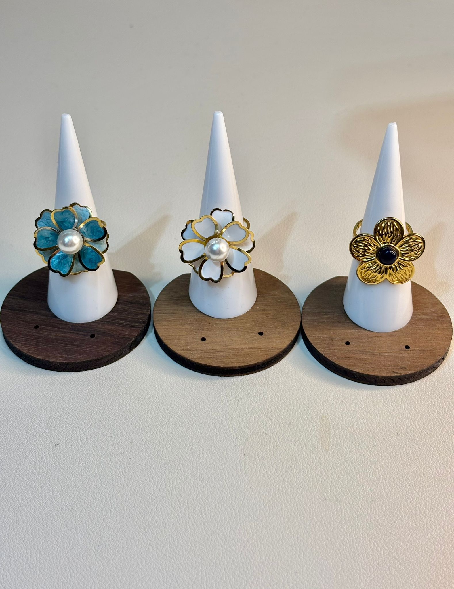 Dale un toque único y femenino a tu look con estos anillos de diseño floral. Su acabado esmaltado y detalle central tipo perla o piedra los convierten en piezas elegantes y llamativas, perfectas para cualquier ocasión.